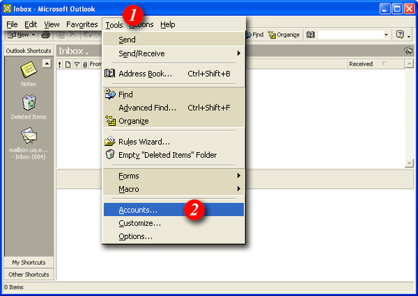 | 2)Select 'Accounts'. (Note: if you see 'Services' instead of accounts, Outlook 2000 is running in Corporate mode and you should not continue with this guide. Please return to the main page and select the Outlook 2000 Corporate mode guide). | |||||