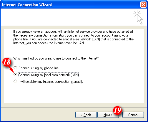 | 18)Select the 'Connect using my local area network (LAN)' option. It's advisable to select this option even if you connect to the Internet using a dialup connection. | |||||